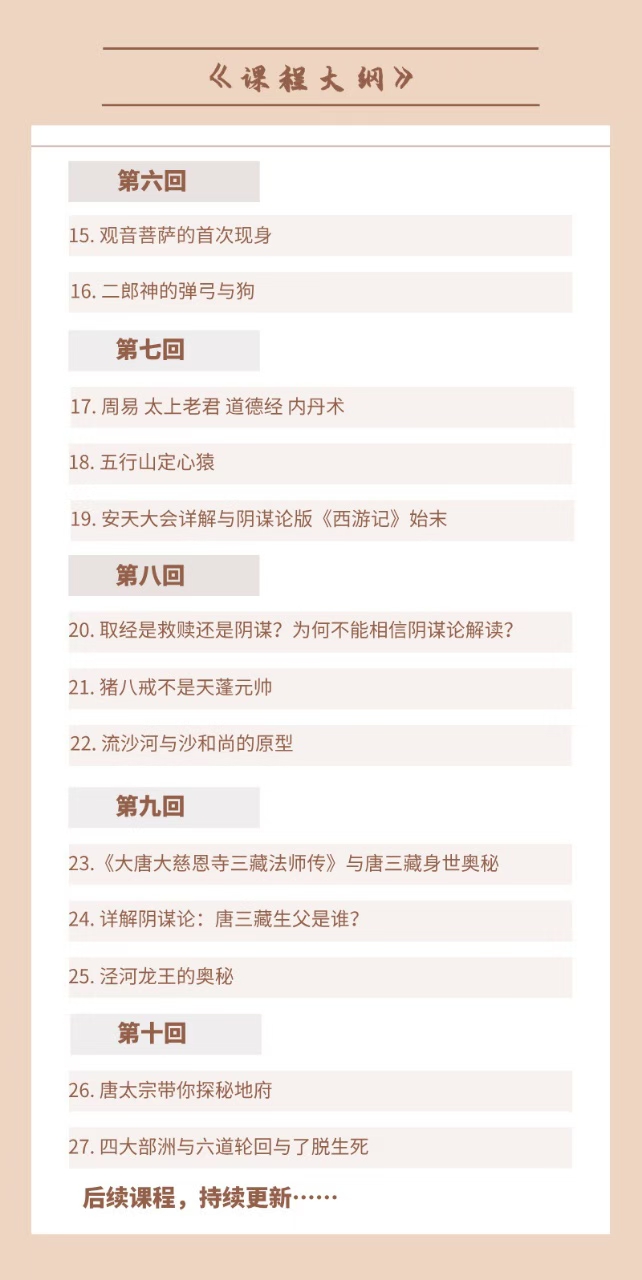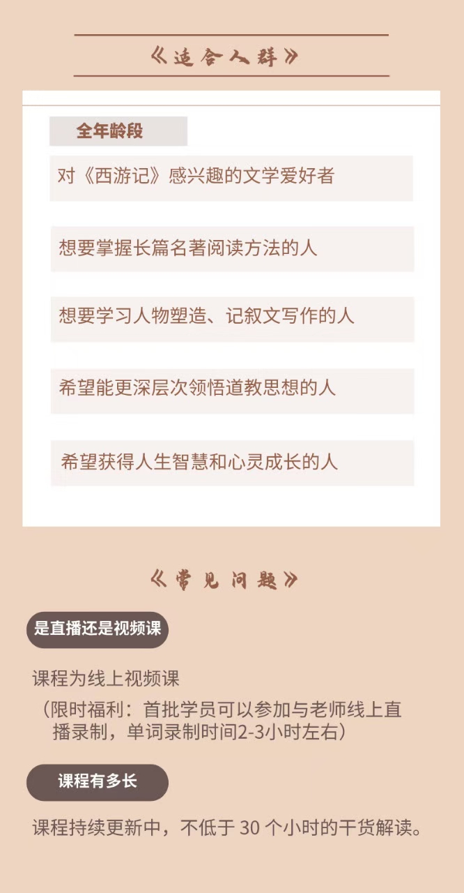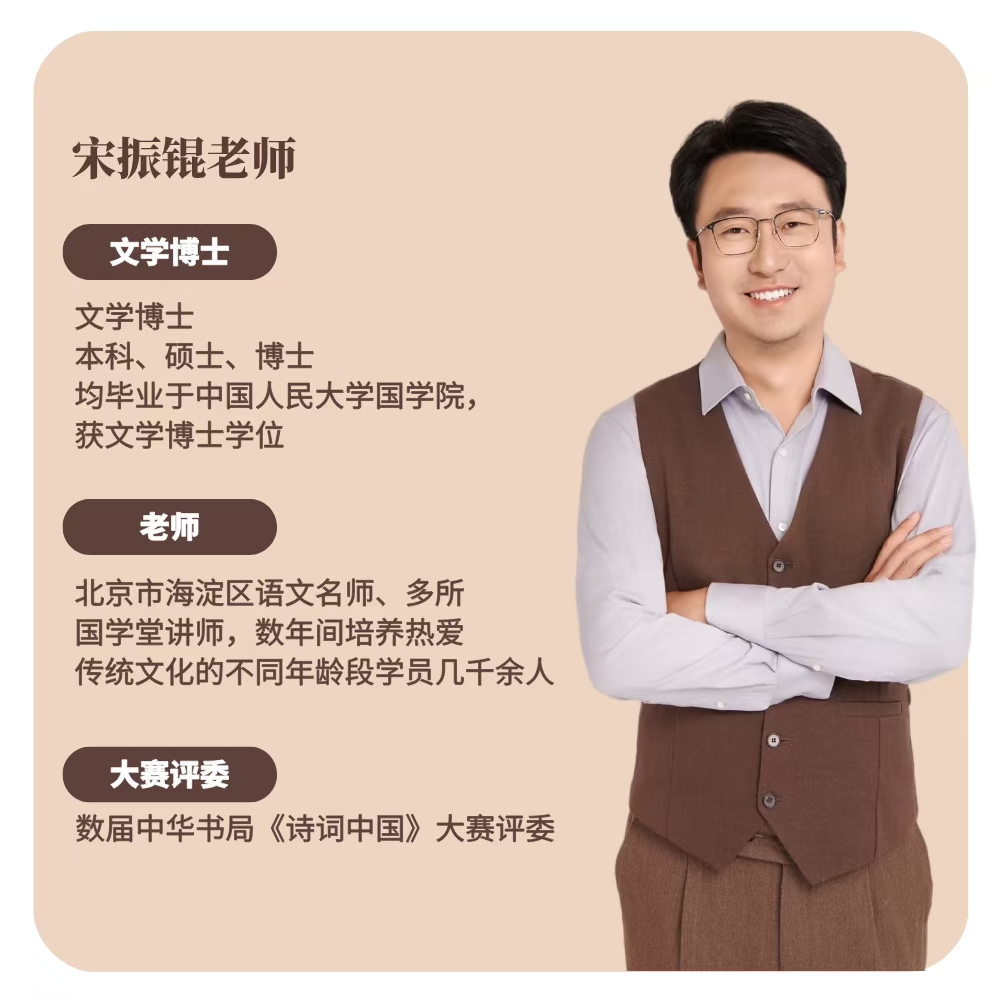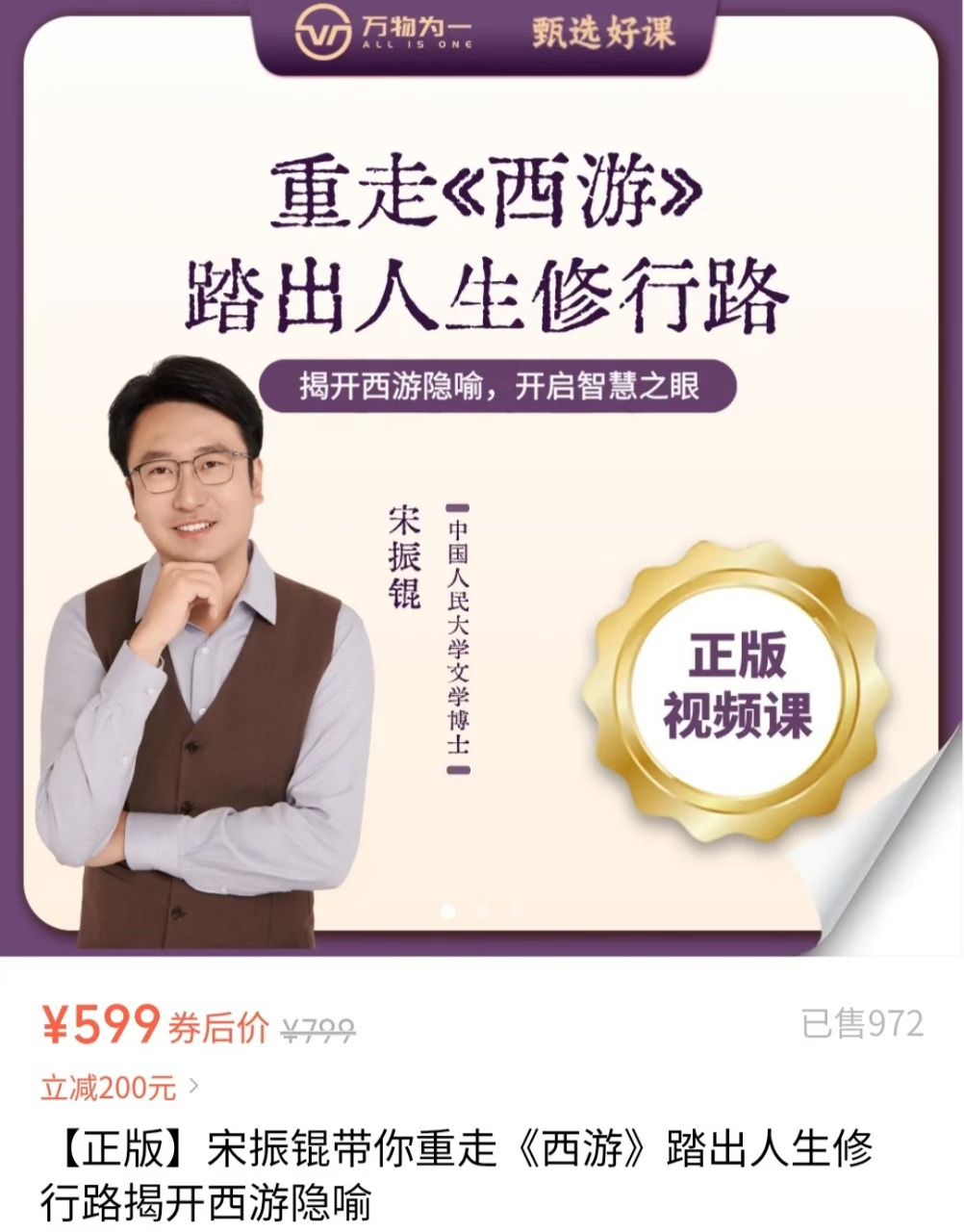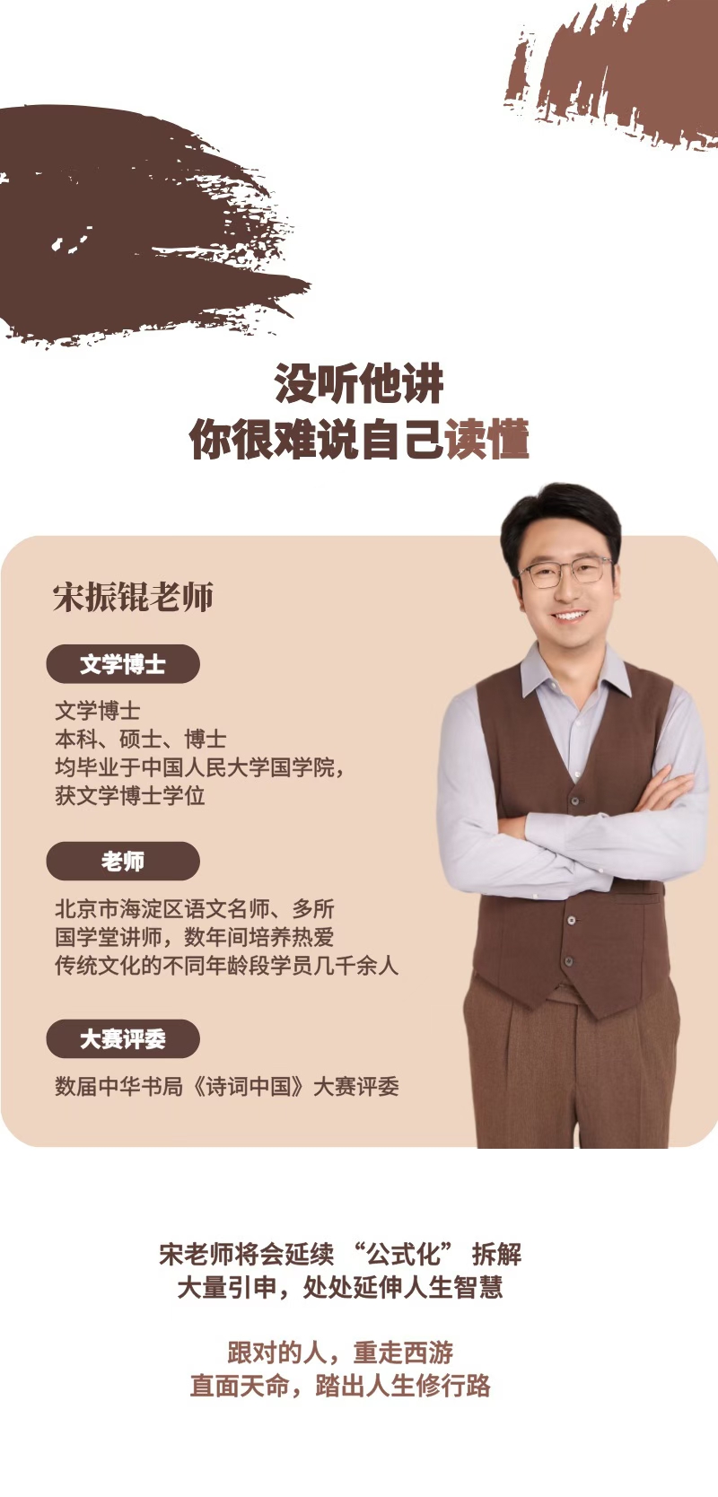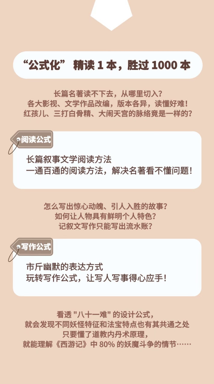 宋振锟博士带你重走《西游》踏出人生修行路,揭开西游隐喻,开启智慧之眼为什么一定要读《西游记》,《西游记》里人物形象深入人心,像极了现实的我们《西游记》借假修真,为我们修心指明方向写人容易,画神魔难,“八十一难”各有源头,是明朝世情的写实与折射、又蕴含儒释道思想内核又折射了普通人的内心世界:一切烦恼、困惑、欲望没听他讲,你很难说自己读懂,宋老师将会延续”公式化“拆解大量引申,处处延伸人生智慧跟对的人,重走西游直面天命,踏出人生修行路,“公式化”精读1本,胜过1000本一通百通的阅读方法,解决名著看不懂问题!怎么写出惊心动魄、引人入胜的故事?如何让人物具有鲜明个人特色?记叙文写作只能写出流水账?写作公式市斤幽默的表达方式玩转写作公式,让写人写事得心应手!只要懂了道教内丹术原理,就能理解《西游记》中80%的妖魔斗争的情节,八重维度讲解全面学透西游,道教金丹文化 ,王阳明“心”学文化,禅宗文化,儒家文化
