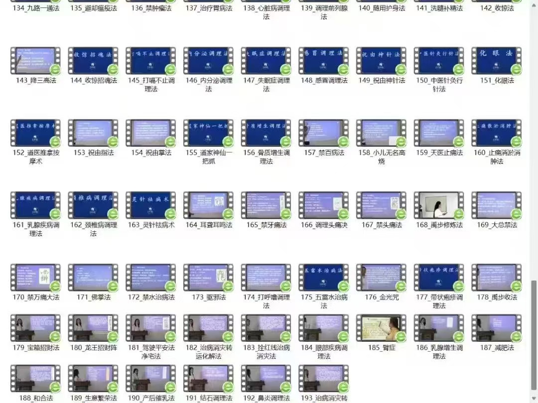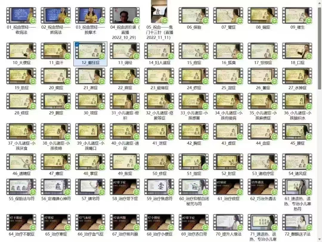 💫【祝由】宫书沐院 天迦 新版 祝十由三科 全193讲古代治病除了道医,还有祝由十三科等,也就是所说的“祝由术”。祝由科是古代医术的一种流派,即祝说病由,不需用针灸或药来治病,是巫术治疗法。唐代太医署中设立咒禁科,到元明之际太医院设立十三科,祝由科是第十三科。后来传说有祝由十三法,因在湖南辰州多有巫师使用此类方法,所以又名辰州法,并不是简单的化学魔术。祝由的治病工具 大自然的正炁被我们拟人化地称为“神仙”,明白了这一点,就不难理解“祝由就是向神灵祝说患病的原因并祈祷神灵加持”这句话了。那么,我们又怎样向神灵祈祷、与神灵沟通,来调动大自然的正炁呢?初学者就必须借助于一些工具,那就是:符、咒、寄、化。符法与咒法(禁法),大家相对来说比较熟悉,都领略了符咒的神奇疗效。对于疼痛或其它症状,只要是功能性的病变,用符咒也就足够了。
