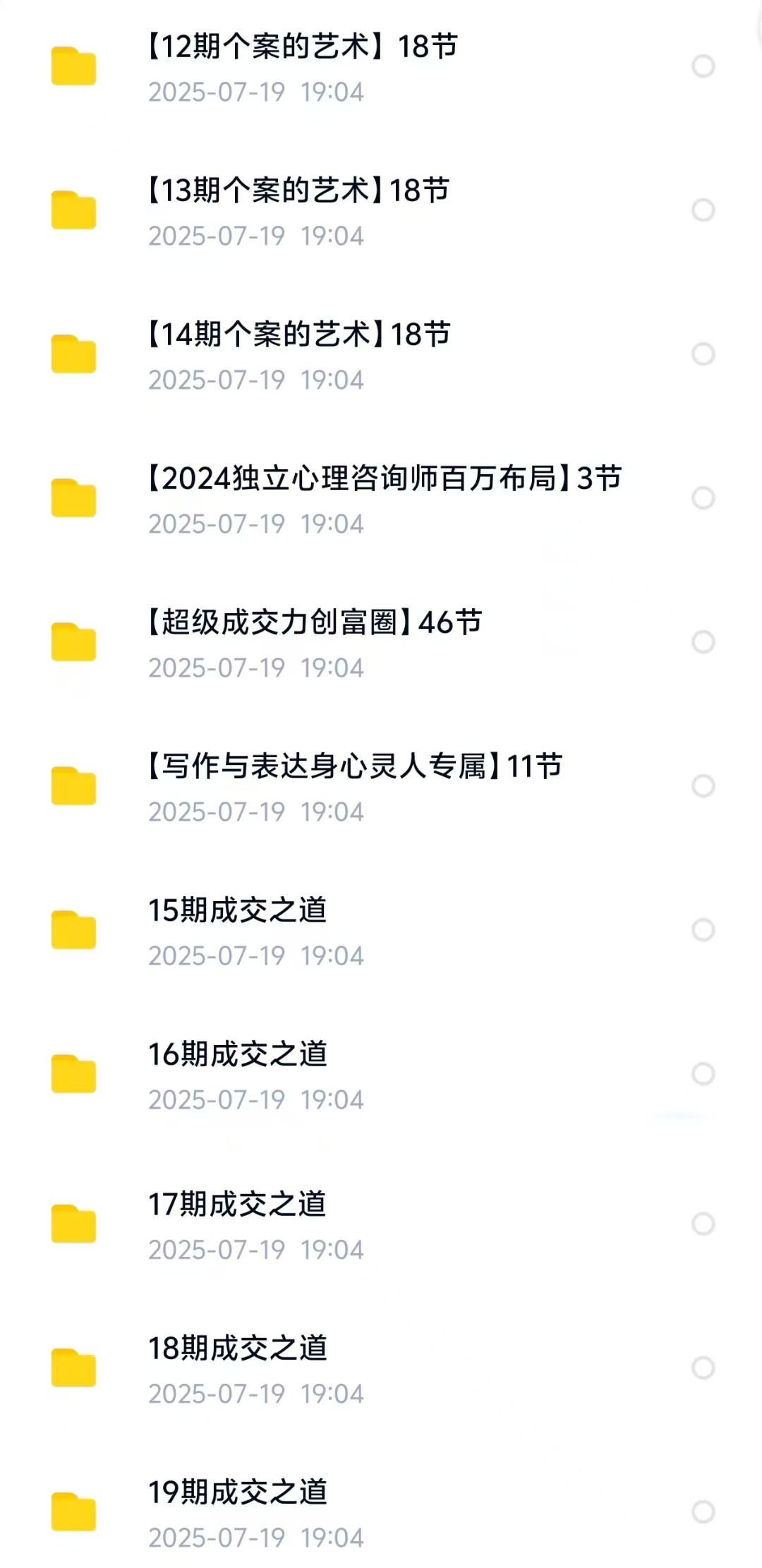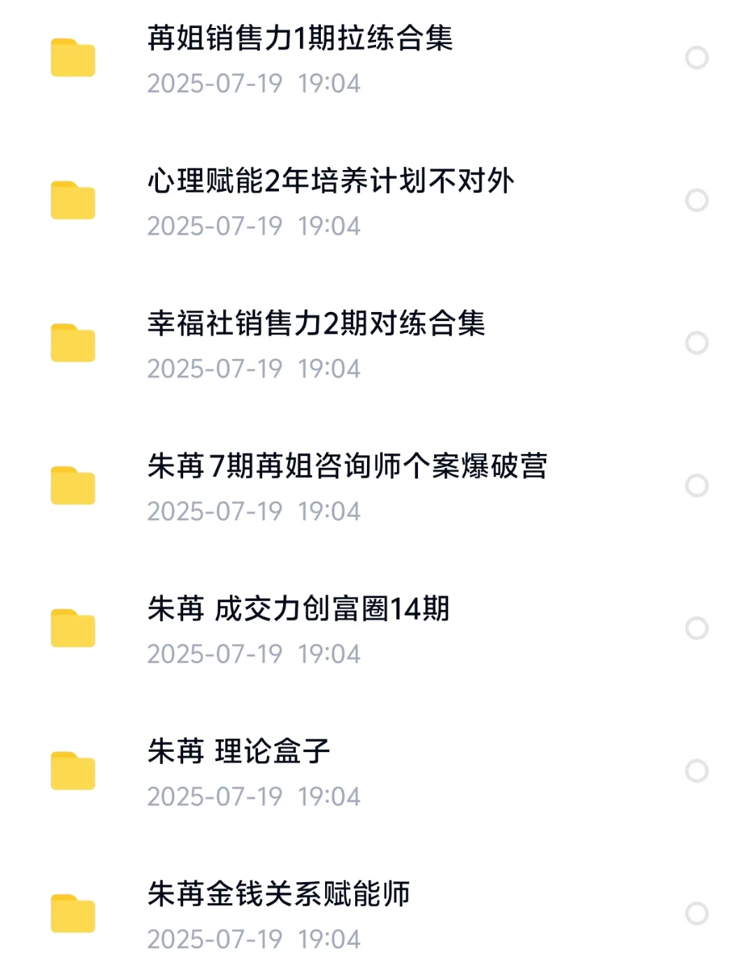 朱苒课程合集☸️【2024朱苒课程合集全28套】成交之道,为什么能够成交那么多人呀?因为我们的服务是一个系统✨许多人都说,出了成交之道,再没有见过那么牛的交付天花板了,能不能做一个好的成交,也是特别考验一个人的心性,是否成熟的标志,想要一个好的成交,也要不断的去打磨自己的能力,在成交之道,早课是非常重要的一部分,更多的是贯穿在30天的练习和行动还有一部分是,当你行动有疑惑的时候,有陪伴导师60天的支持,让你行动力更翻倍✨我是朱苒,一名坦荡爱钱的心理学创业者让每一位心理赋能师、心理咨询师、心理疗愈师都能,用咨询,过上好日子⭐️来到成交之道,爱上成交之道,通过成交之道调整自身的状态,你只需要听话照做就成交了。