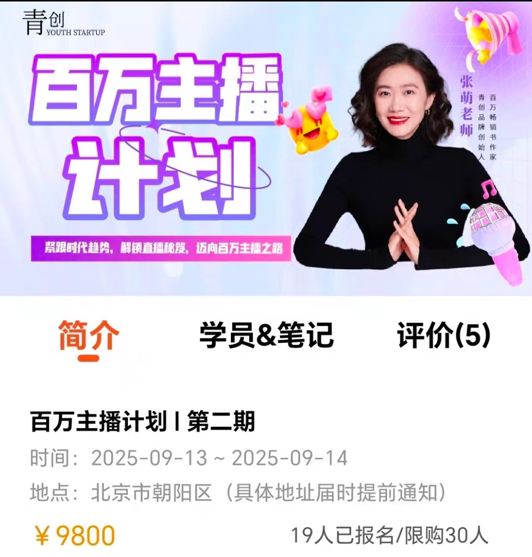 张萌 | 萌姐百万主播计划 第二期想成为一名真正的主播,却总是停留在“想一想”“看一看”的阶段?别再做观望的咸鱼了,是时候真正迈出那一步!为什么要加入?实战导师张萌:用过往经验手把手带你入门,避开弯路。系统化课程:从定位、内容打造到变现,每一步都有清晰路径。成长社群支持:不再孤军奋战,和一群有梦想的人并肩前行。适合谁?想进入直播赛道但不知道如何开始的人想突破瓶颈,把直播做成长期事业的人渴望通过直播打造个人品牌,实现财富跃迁的人这不是“速成秘籍”,也不是“空话激励”。这是一次真正从0到1的训练,让你看见自己成为百万主播的可能。如果你准备好了,不妨现在就开始。