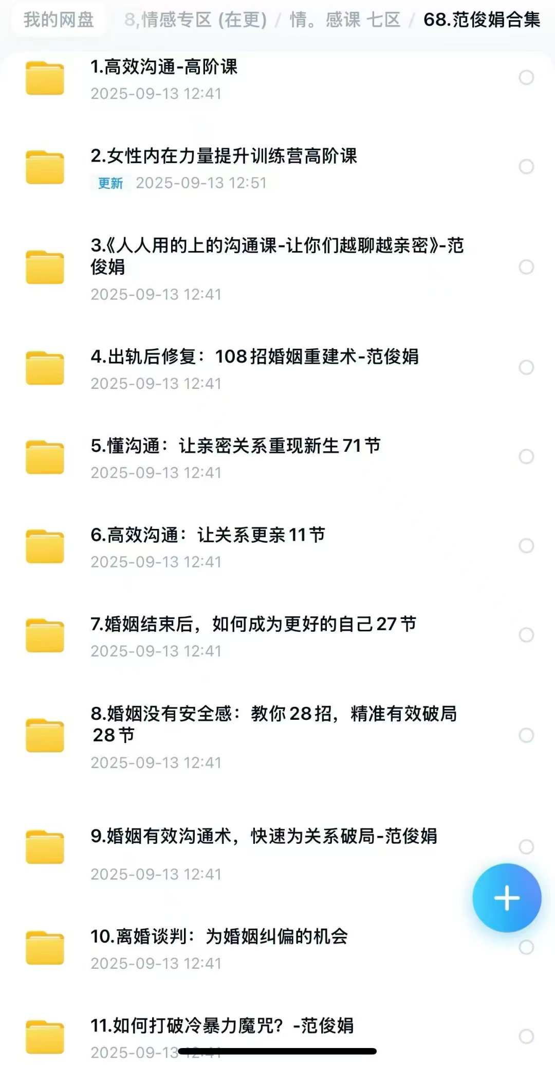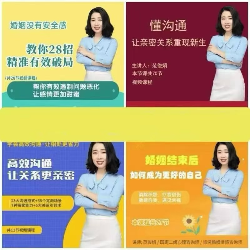 范俊娟婚姻课11门合集1、出轨后修复:108招婚姻重建术2、婚姻有效沟通术,快速为关系破局3、婚姻结束后,如何成为更好的自己4、婚姻没有安全感:教你28招,精准有效破局5、离婚谈判:为婚姻纠偏的机会6、高效沟通:让关系更亲密7、人人用的上的沟通课-让你们越聊越亲密8、高效沟通-高阶课9、女性内在力量提升训练营 高阶课10、懂沟通:让亲密关系重现新生11、如何打破冷暴力魔咒?