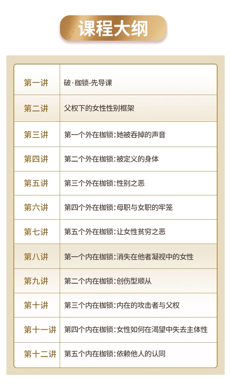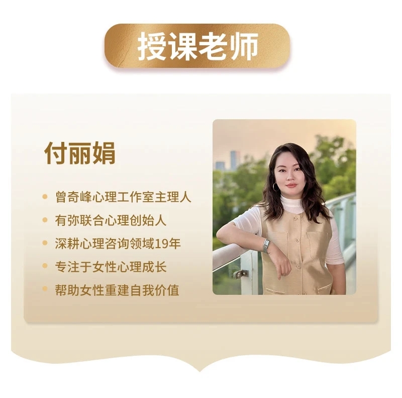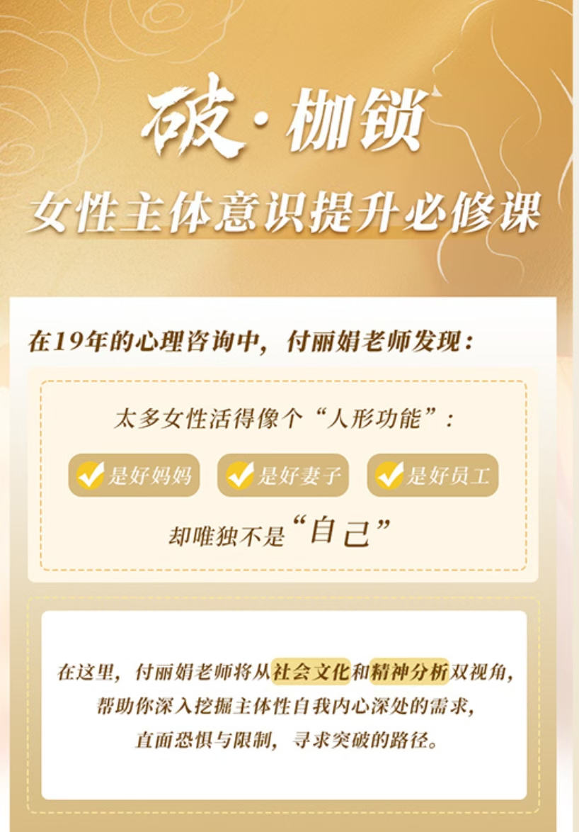 付丽娟 破·枷锁 女性主体意识提升必修课39.9🧧付丽娟老师亲授,19年心理咨询经验帮助女性突破”好妈妈、好妻子、好员工”的角色束缚课程内容:- 深度剖析自我- 重建健康关系- 活出自主人生- 付丽娟老师亲授适合:- 总为他人活的你- 被工作生活压垮的你- 边界模糊的你- 想变不敢变的你课程收获:- 看清枷锁- 斩断束缚- 夺回主体- 走出”为别人活”的迷宫