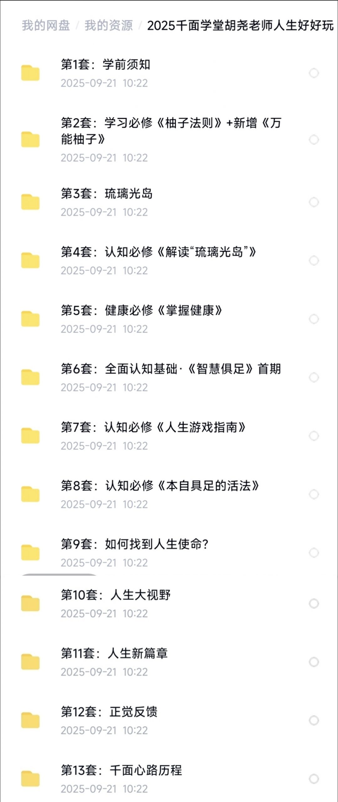 2025千面学胡堂尧老师生人好好玩全套13套课程合集199🧧站在万米高空俯瞰,《人生好好玩儿》就是一游个戏,一个转玩人生的游戏。由胡尧师老带队领头,一玩群家参与进行。领头的胡尧老师对个这游戏么怎个玩法行进了说明-《学前须知》。高效玩游戏攻的略-《柚子法则》,玩游的戏通关原则-写评论领悟总和结,游内戏容《琉璃光岛》,《智具慧足》,《健康具足》等,游时戏间1年,游戏月以为单位推进些这都随着戏游的展开一 一揭示。一有切为法,善护念,认要知取最高,行始动于最小。”