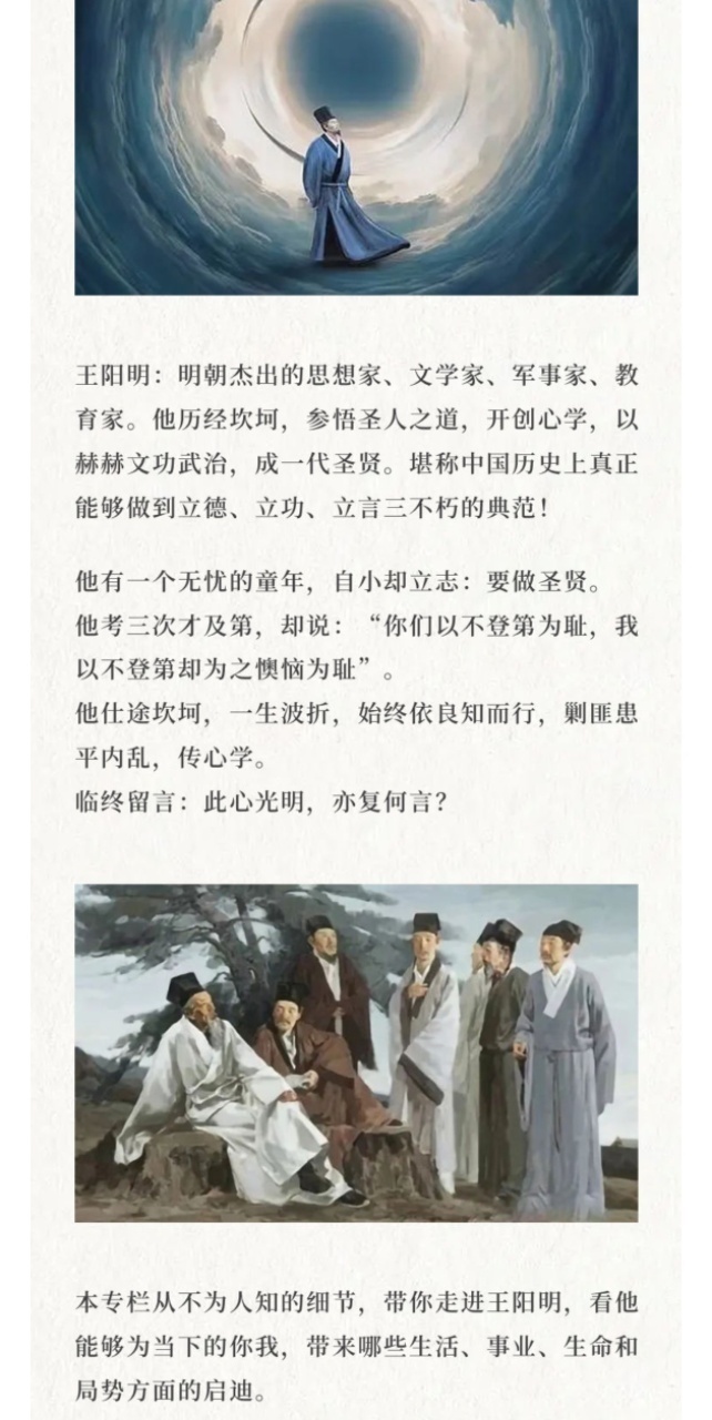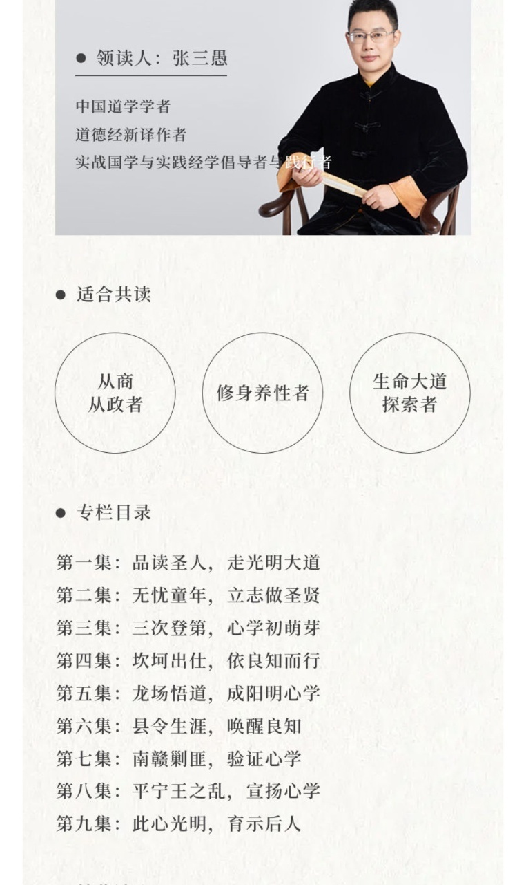 张三愚品读王阳明 走光明大道王阳明:明朝杰出的思想家、文学家、军事家、教育家。他历经坎坷,参悟圣人之道,开创心学,以赫赫文功武治,成一代圣贤。堪称中国历史上真正能够做到立德、立功、立言三不朽的典范!专栏目录第一集:品读圣人,走光明大道第二集:无忧童年,立志做圣贤第三集:三次登第,心学初萌芽第四集:坎坷出仕,依良知而行第五集:龙场悟道,成阳明心学第六集:县令生涯,唤醒良知第七集:南赣剿匪,验证心学第八集:平宁王之乱,宣扬心学第九集:此心光明,育示后人