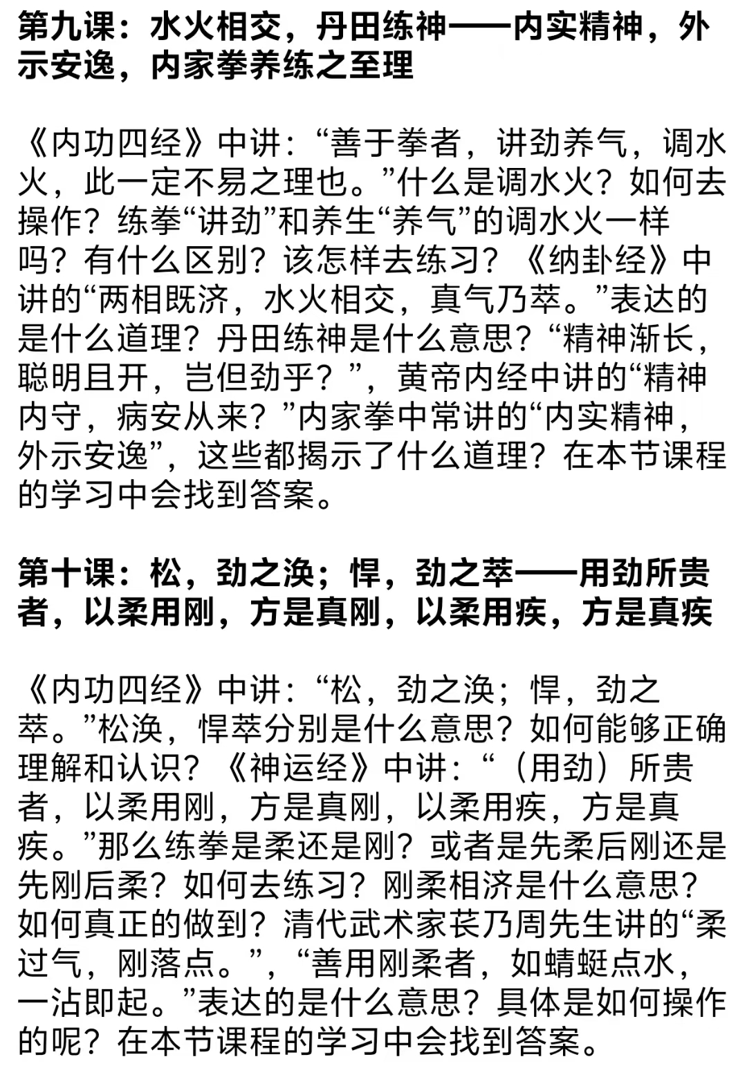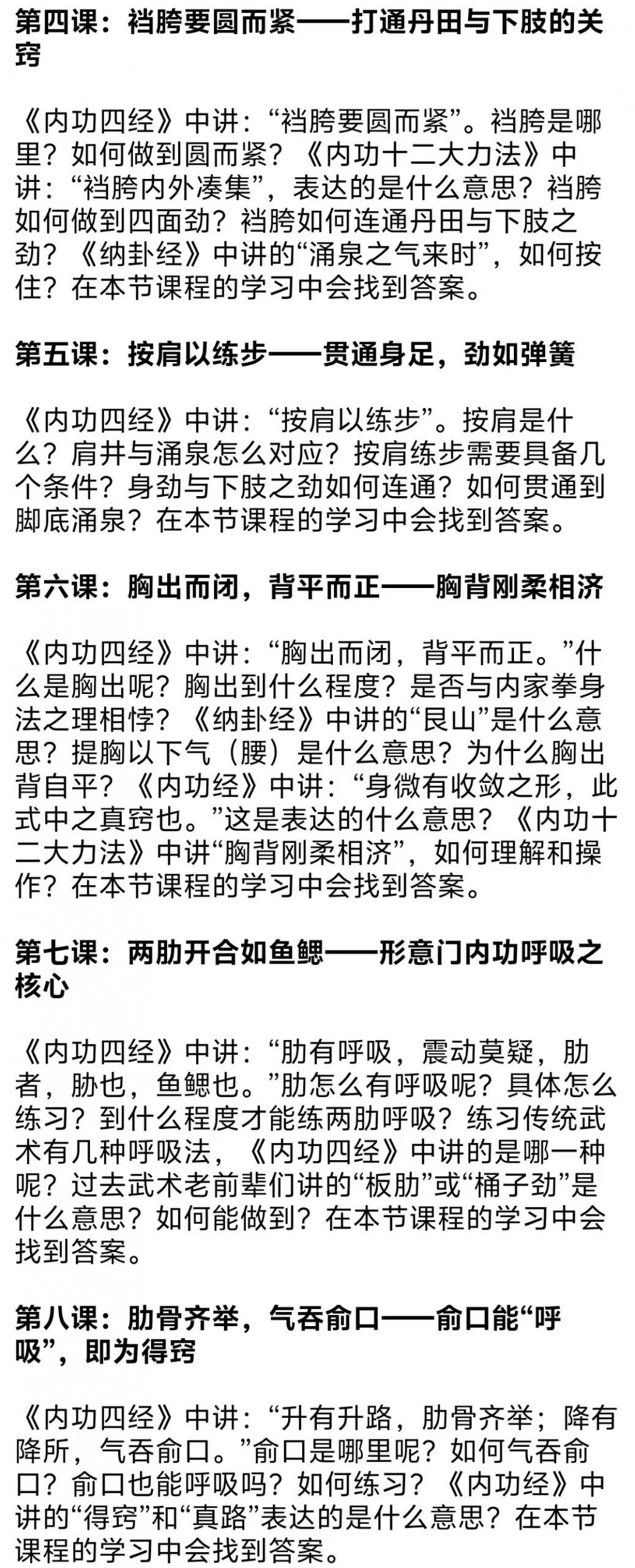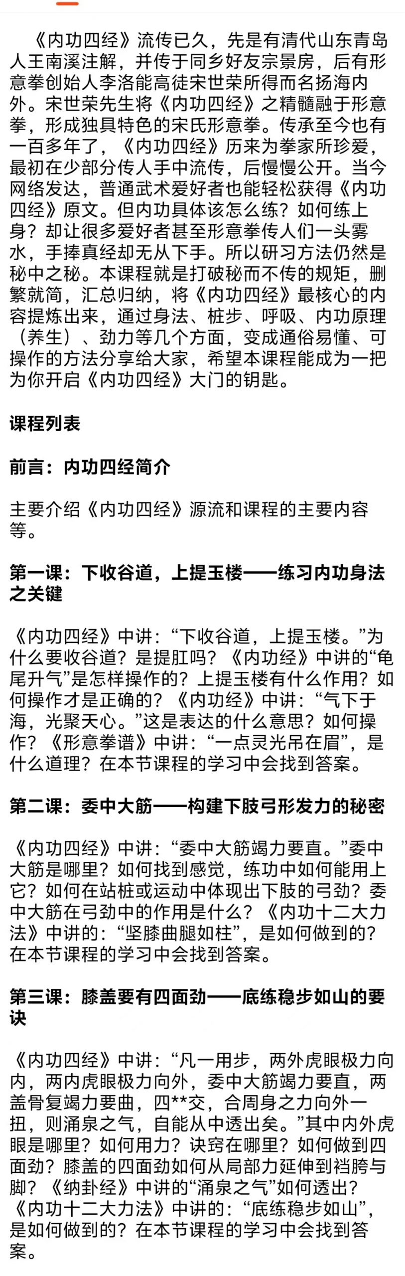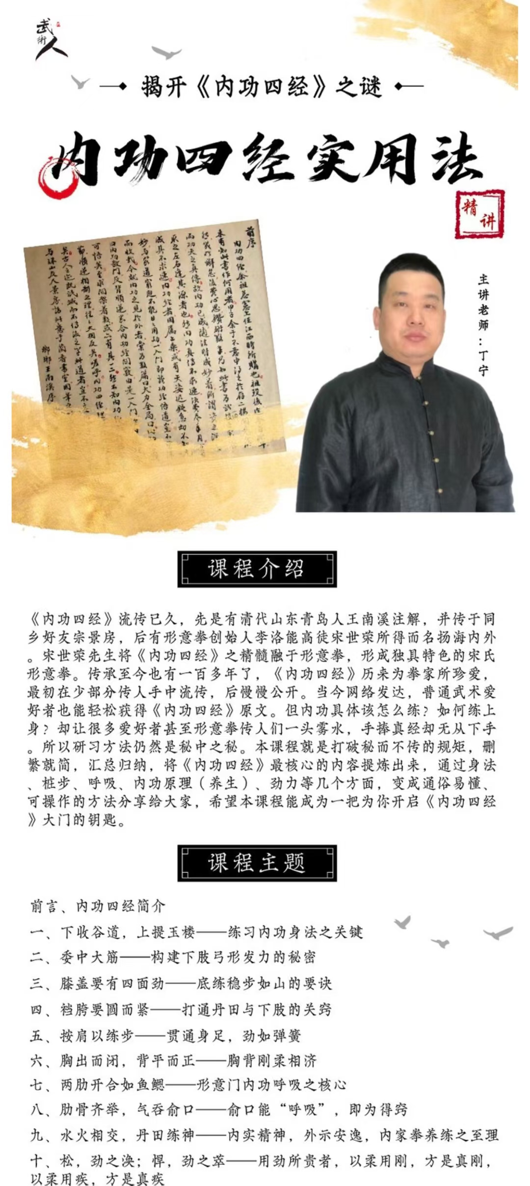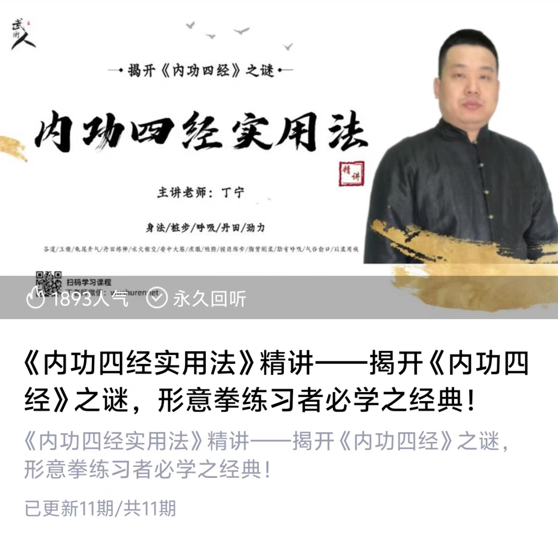 💫《内功四经实用法》精讲——揭开《内功四经》之谜,形意拳练习者必学之经典!本课程打破秘而不传的规矩,删繁就简,汇总归纳,将《内功四经》最核心的内容提炼出来,通过身法、桩步、呼吸、内功原理(养生)、劲力等几个方面,变成通俗易懂、可操作的方法分享给大家,希望本课程能成为一把为你开启《内功四经》大门的钥匙
