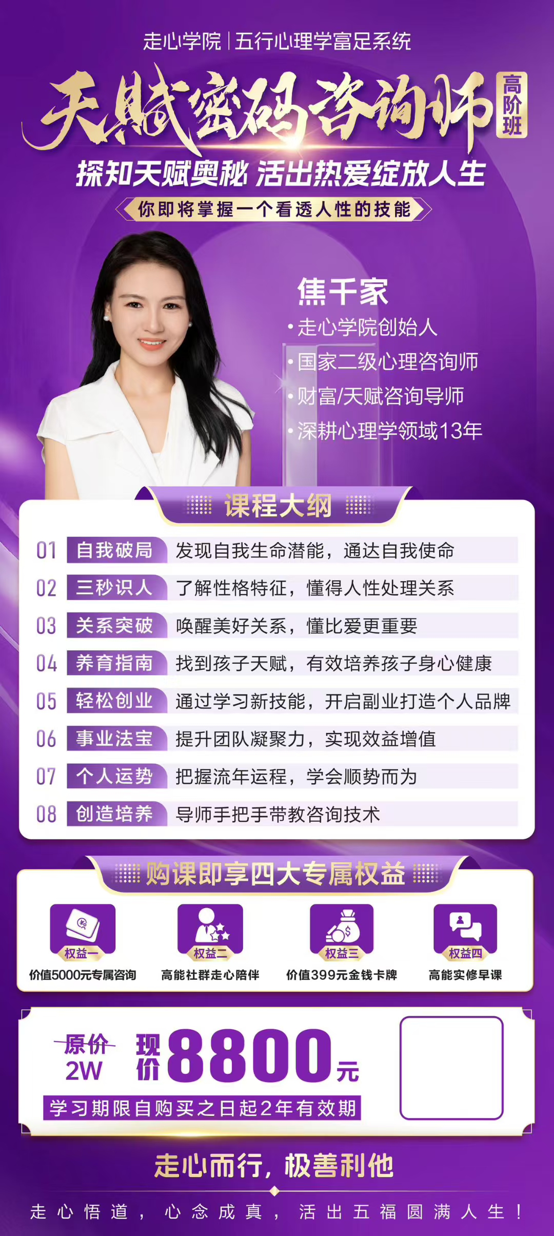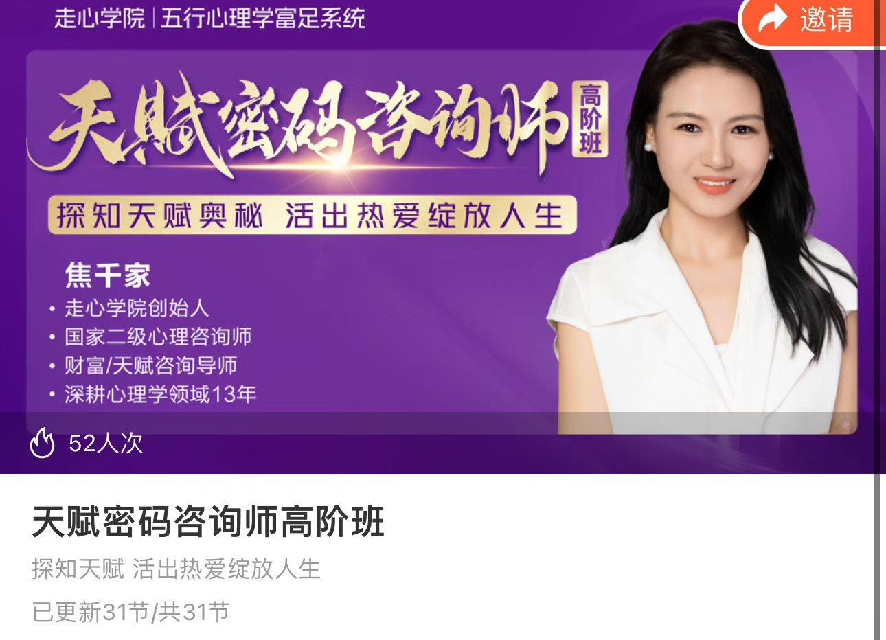 💫走心学院 焦千家老师 天赋密码咨询师高阶班 31节视频课程 全 课程原价8800探知天赋奥秘 活出热爱绽放人生