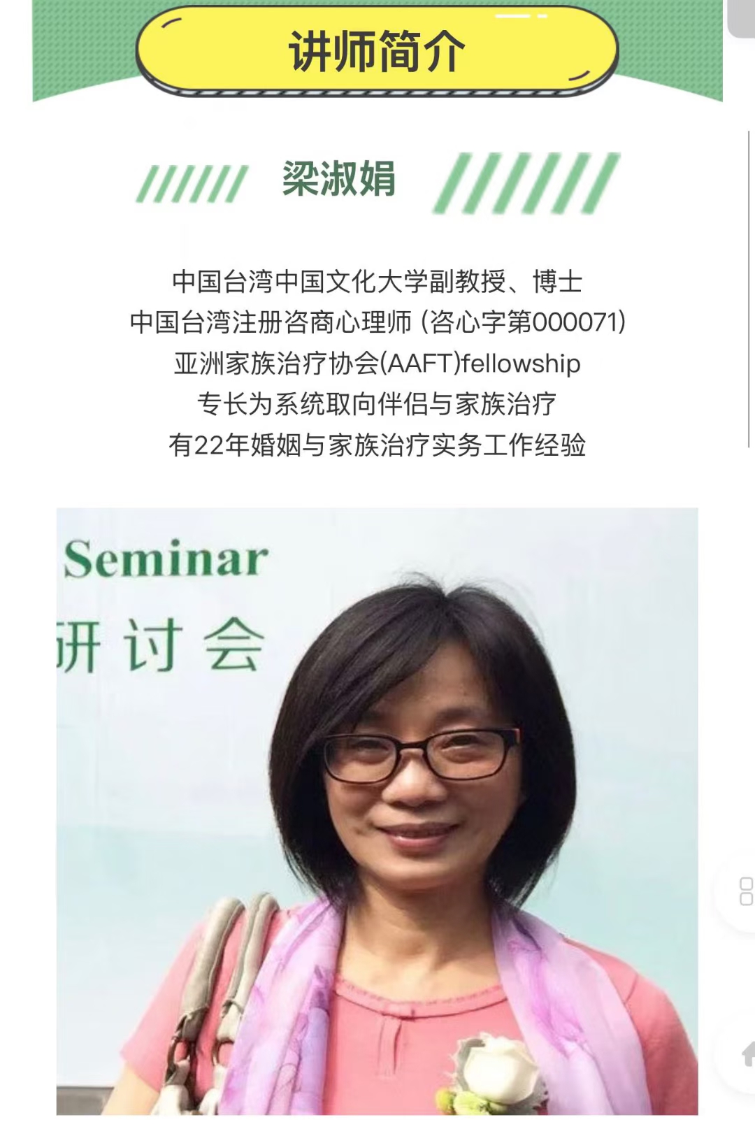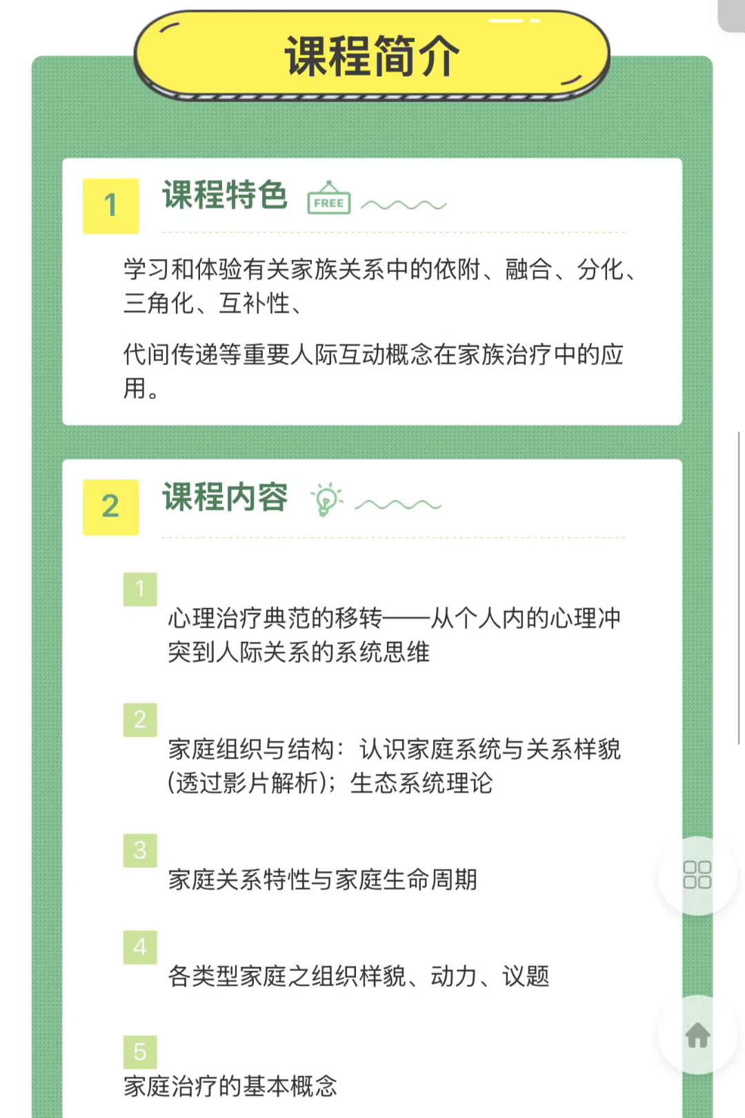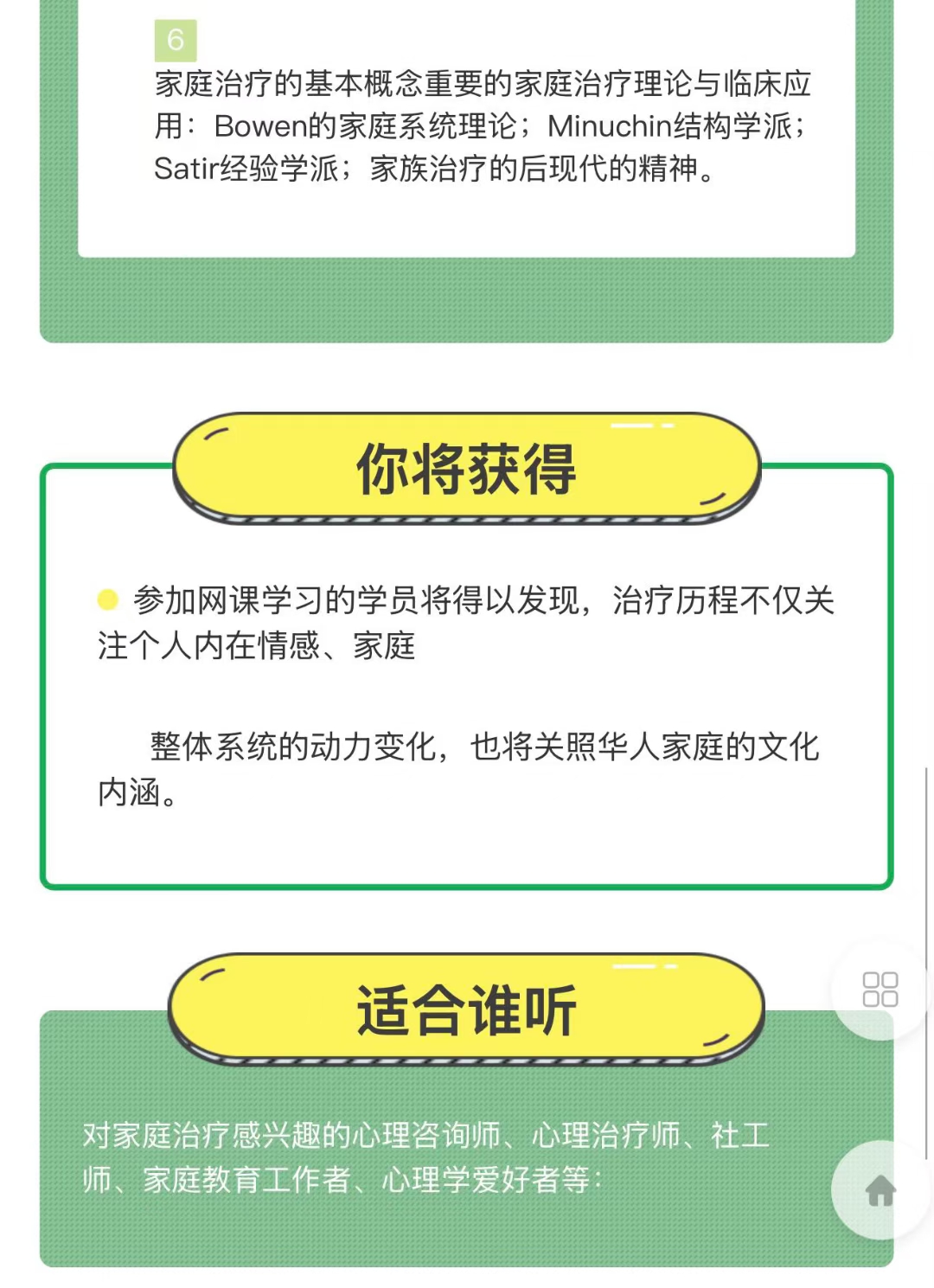 💫梁淑娟:多世代系统性家庭治疗理论与实务专业系列培训视频课程学习和体验有关家族关系中的依附、融合、分化、三角化、互补性、代间传递等重要人际互动概念在家族治疗中的应用。