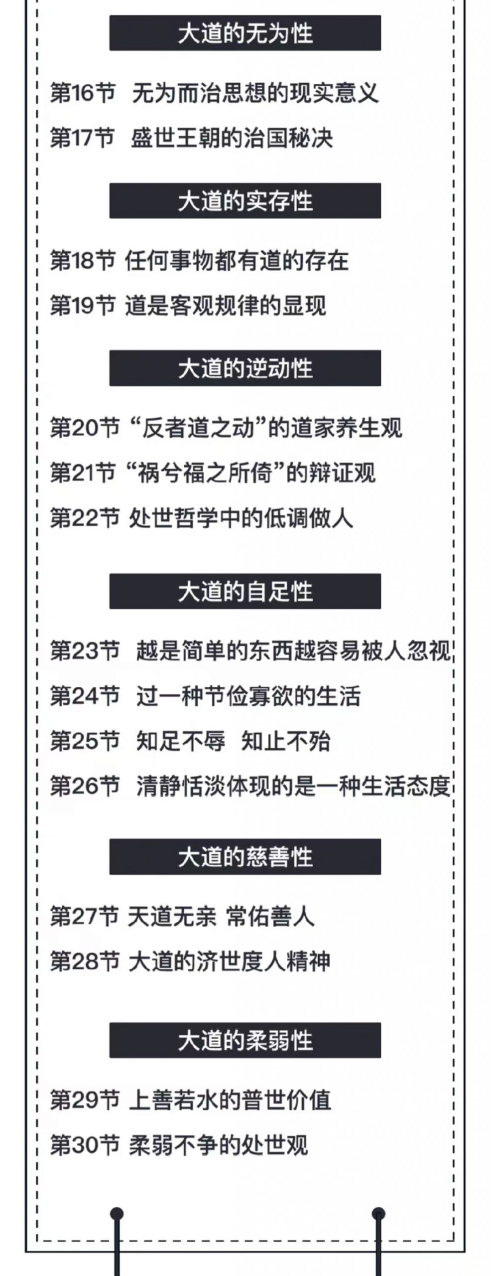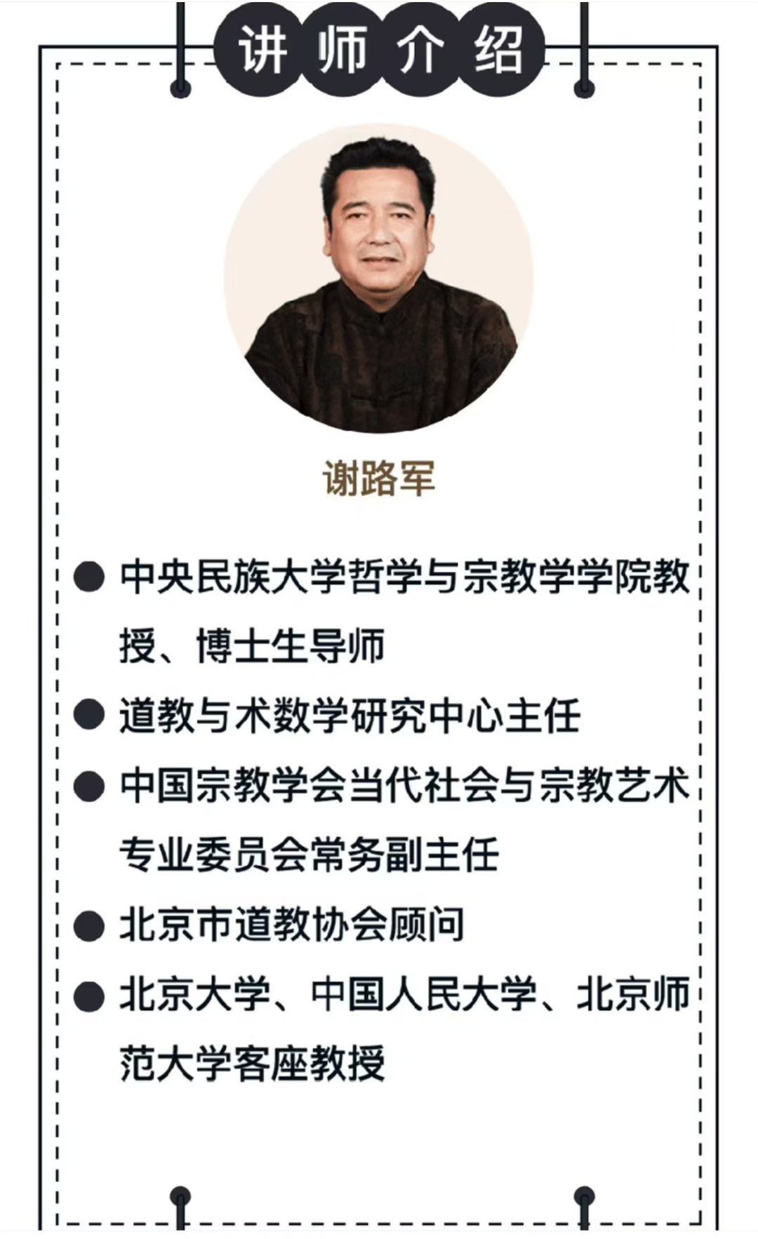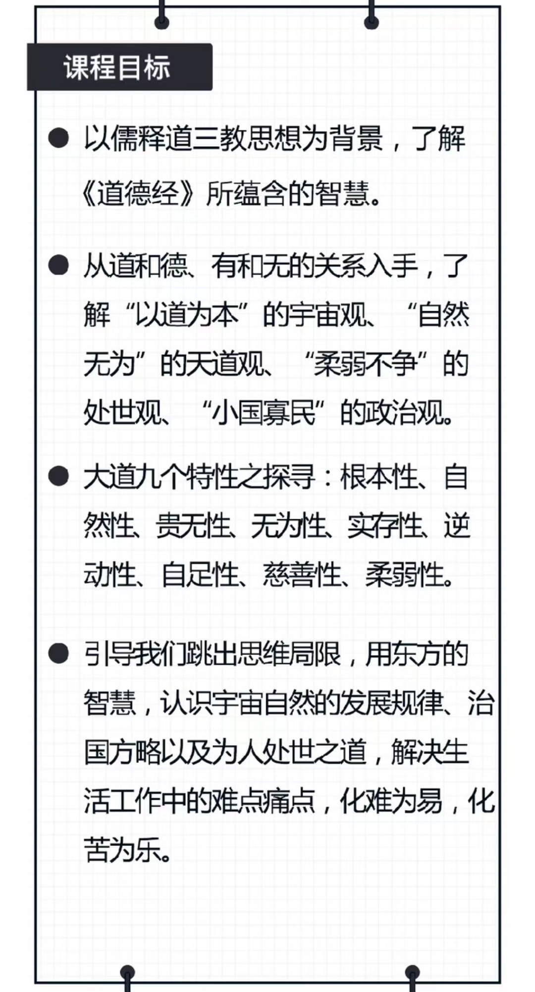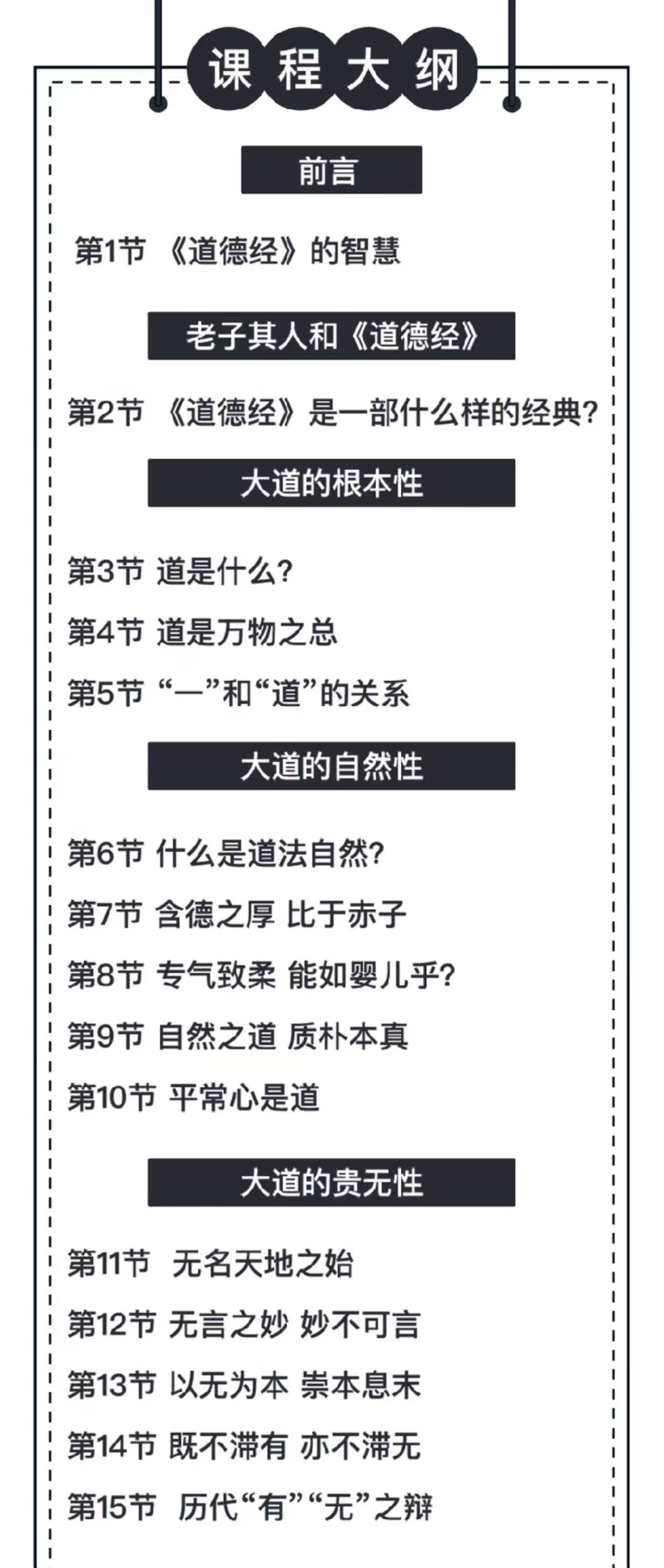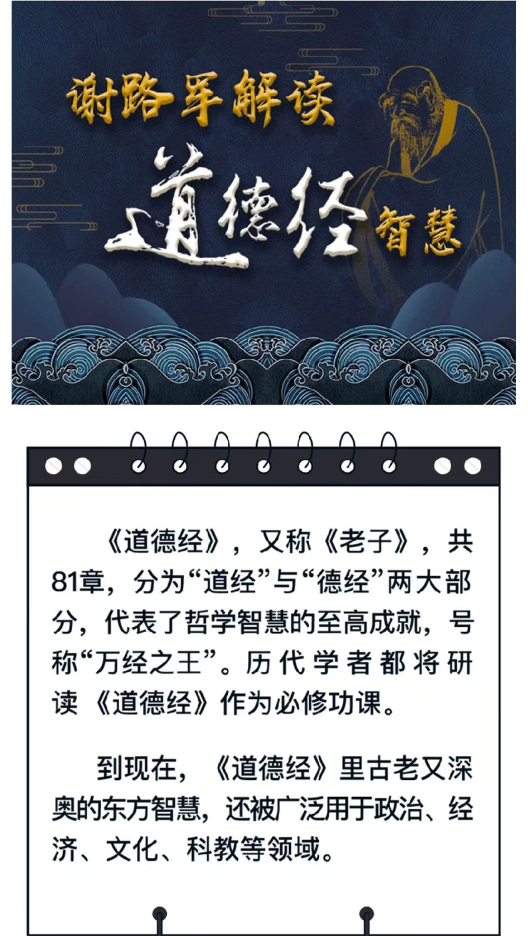 💫谢路军解读“道德经”智慧《道德经》,又称《老子》。共81章,分为“道经”与“德经”两大部分,代表了哲学智慧的至高成就,号称“万经之王”。历代学者都将研读《道德经》作为必修功课。到现在,《道德经》里古老又深奥的东方智慧,还被广泛用于政治、经济、文化、科教等领域。课程目标以儒释道三教思想为背景,了解《道德经》所蕴含的智慧。从道和德、有和无的关系入手,了解“以道为本”的宇由观、“自然无为”的天道观“柔弱不争”的处世观“小国寡民”的政治观。大道九个特性之探寻:根本性、自然性、贵无性、无为性、实存性、逆动性、自足性、慈善性、柔弱性。引导我们跳出思维局限,用东方的智慧,认识宇宙自然的发展规律、治国方略以及为人处世之道,解决生活工作中的难点痛点,化难为易,化苦为乐。