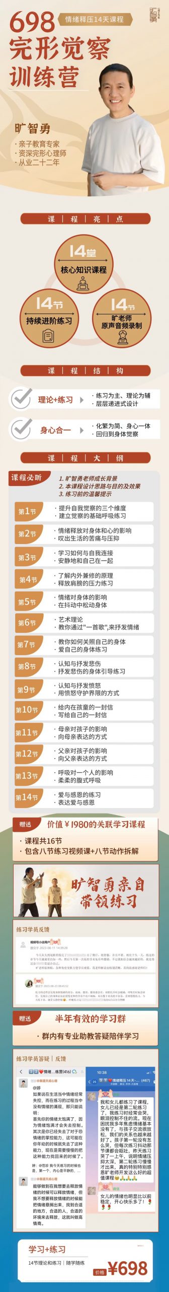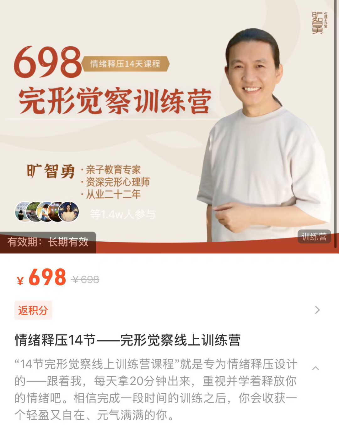 💫旷智勇 情绪释压14天——完形觉察线上训练营“14天完形觉察线上训练营课程”就是专为情绪释压设计的——跟着我,每天拿20分钟出来,重视并学着释放你的情绪吧。